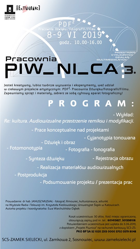 Jest to kontynuacja projektu artystycznego,który zgłębia wybrane zagadnienia, angażując różne media: fotografię, film i dźwięk. Zapraszamy do artystycznych eksperymentów i tworzenia pod okiem artysty prowadzącego. Zaprezentujemy niszowe techniki sztuk wizualnych. Motywem przewodnim tegorocznej edycji warsztatów jest strategia twórczego remiksu i reinterpretacji współczesnych oraz archiwalnych materiałów audiowizualnych. Podczas warsztatów powstaną cyjanotypie, fotomonotypie, fotografie cyfrowe oraz krótkie formy filmowe z kompozycją dźwiękową. Podsumowaniem projektu będzie ekspozycja prac w holu Galerii Exravagance.