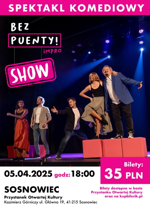 To spektakl komediowy pełen humoru, spontaniczności i niezapomnianych emocji w wykonaniu grupy Bez Puenty Impro. To wieczór, który rozbawi do łez i zostanie w pamięci na długo. Zobaczyć będzie można dynamiczne, krótkie sceny tworzone na żywo, w oparciu o sugestie widzów! Improwizatorzy zaprezentują krótkie gry takie jak „randka w ciemno” czy „kartki z kapelusza”. Każda chwila to eksplozja humoru, a improwizatorzy wkładają całe serce, by zabrać widza w świat nieprzewidywalnej komedii. Bez Puenty Impro Show to sztuka tworzona tu i teraz – bez scenariusza, ale z ogromną dawką charyzmy i energii!