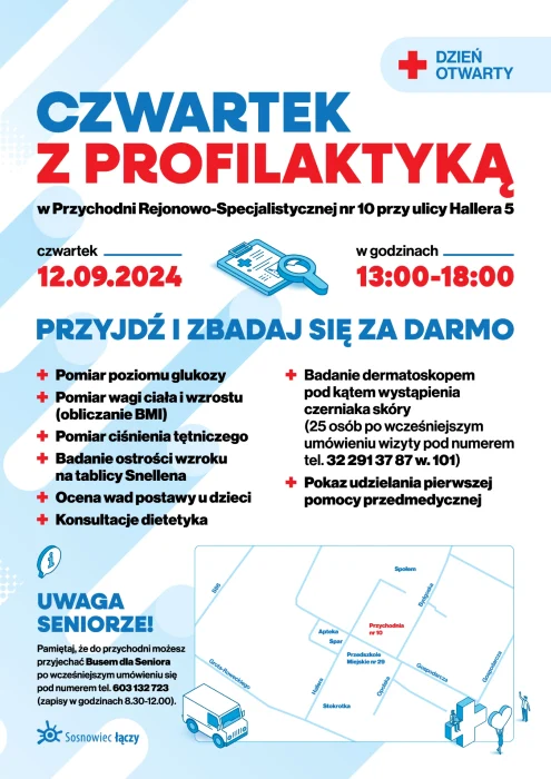 12 września (czwartek) w godz. 13.00-18.00 władze miasta zapraszają na ”Czwartek z profilaktyką”, który odbędzie się w Przychodni Rejonowo – Specjalistycznej nr 10 przy ulicy Hallera 5.