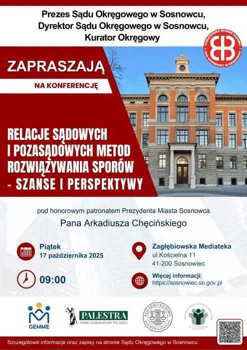 Prezes Sądu Okręgowego w Sosnowcu, Dyrektor Sądu Okręgowego w Sosnowcu i Kurator Okręgowy zapraszają 17 października 2025 r. o godz. 9:00 na konferencję naukową “Relacje sądowych i pozasądowych metod rozwiązywania sporów- szanse i perspektywy” w ramach Międzynarodwego DniaMediacji i Tygodnia Mediacji, kóra odbędzie się w Zagłębiowskiej Mediatece w Sosnowcu przy ul. Kościelnej 11.