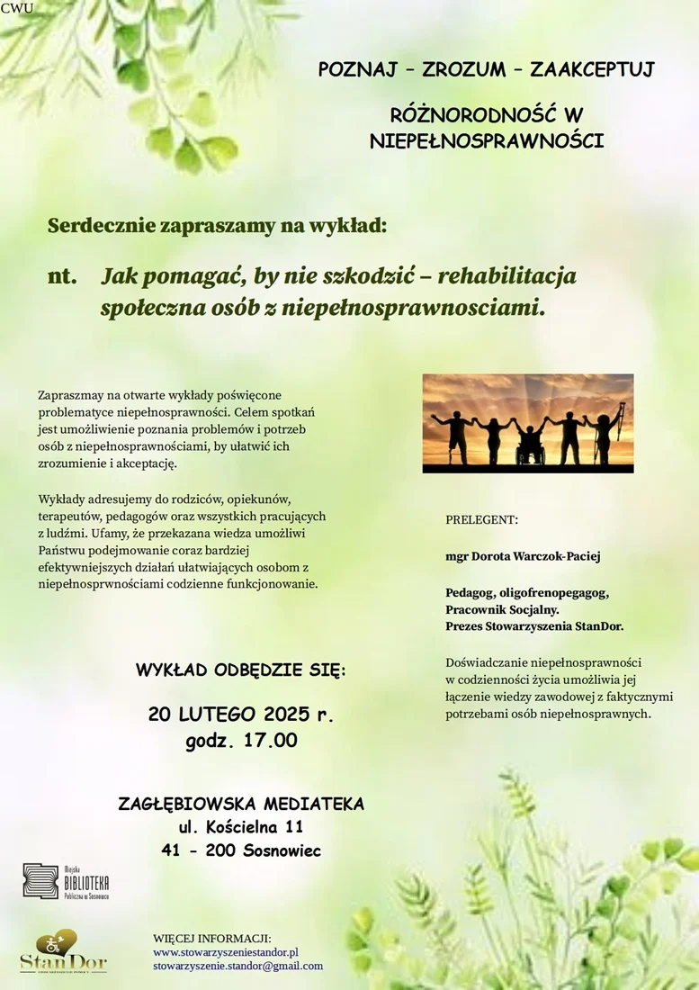 Stowarzyszenie StanDor serdecznie zaprasza na otwarte wykłady poświęcone problematyce niepełnosprawności. W czwartek 20 lutego 2025 o godz. 17.00 w Sali Edukacyjnej Zagłębiowskiej Mediateki przy ul. Kościelnej 11 w Sosnowcu mgr Dorota Warczok-Paciej wygłosi wykład pt. „Jak pomagać, by nie szkodzić – rehabilitacja społeczna osób z niepełnosprawnościami”. Wstęp wolny.