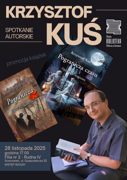 Filia nr 2 – Rudna IV Miejskiej Biblioteki Publicznej w Sosnowcu zaprasza 28 listopada o godz. 17:00 na spotkanie autorskie z Krzysztofem Kusiem, autorem książek „Pogranicza. Opowieści nieoczywiste” oraz „Pogranicza czasu. Opowieści magiczne”. Wstęp na wydarzenie jest wolny.