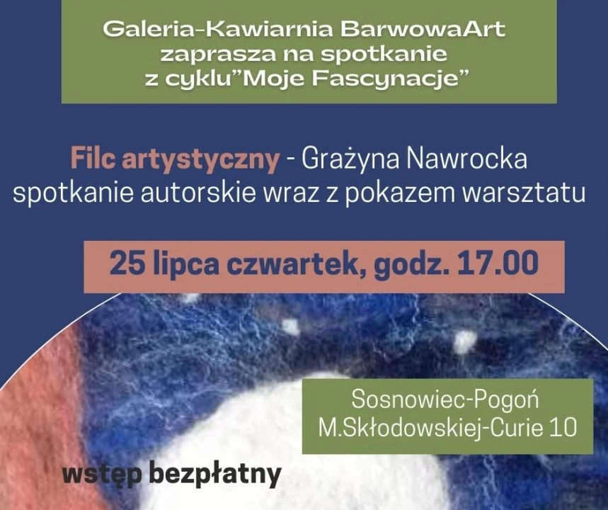 Tym razem Grażyna Nawrocka odkryje przed uczestnikami spotkania, co można wyczarować z filcu artystycznego. Początek spotkania godz.17.00. Udział w wydarzeniu będzie bezpłatny.