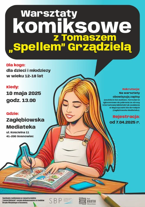 Stowarzyszenie Bibliotekarzy Polskich – Zarząd oddziału w Katowicach – organizator lokalnej edycji akcji „Tydzień Bibliotek”, odbywającej się w tym roku pod hasłem „Biblioteka. Lubię tu być”, wraz z Miejską Biblioteką Publiczną w Sosnowcu – serdecznie zapraszają do udziału w bezpłatnych warsztatach z Tomaszem „Spellem” Grządzielą – autorem komiksów!
