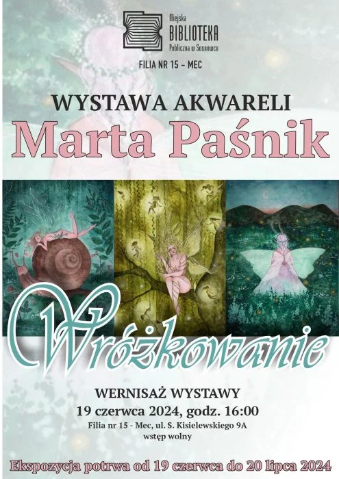Filia nr 15 – Mec Miejskiej Biblioteki Publicznej w Sosnowcu serdecznie zaprasza na wernisaż wystawy akwareli Marty Paśnik „Wróżkowanie”, który odbędzie się w środę 19 czerwca 2024 o godz. 16.00 w siedzibie biblioteki przy ul. S. Kisielewskiego 9a. Wystawa potrwa do 20 lipca 2024. Wstęp wolny.