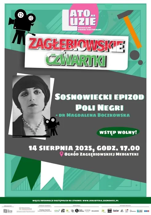 Miejska Biblioteka Publiczna w Sosnowcu – organizator akcji „Lato na luzie – wakacyjne pikniki kulturalne”, w tym cyklu „Zagłębiowskie czwartki”, serdecznie zaprasza 14 sierpnia 2025 o godz. 17.00 do udziału w plenerowym wykładzie w Ogrodzie Zagłębiowskiej Mediateki (ul. Kościelna 11), zatytułowanym „Sosnowiecki epizod Poli Negri”. W roli prelegentki wystąpi dr Magdalena Boczkowska. Wstęp wolny.
