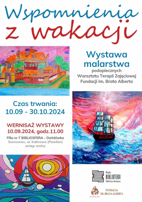 Miejska Biblioteka Publiczna w Sosnowcu – Filia nr 7 zaprasza na wernisaż wystawy prac plastycznych podopiecznych Warsztatu Terapii Zajęciowej Fundacji im. Brata Alberta “Wspomnienia z wakacji”.