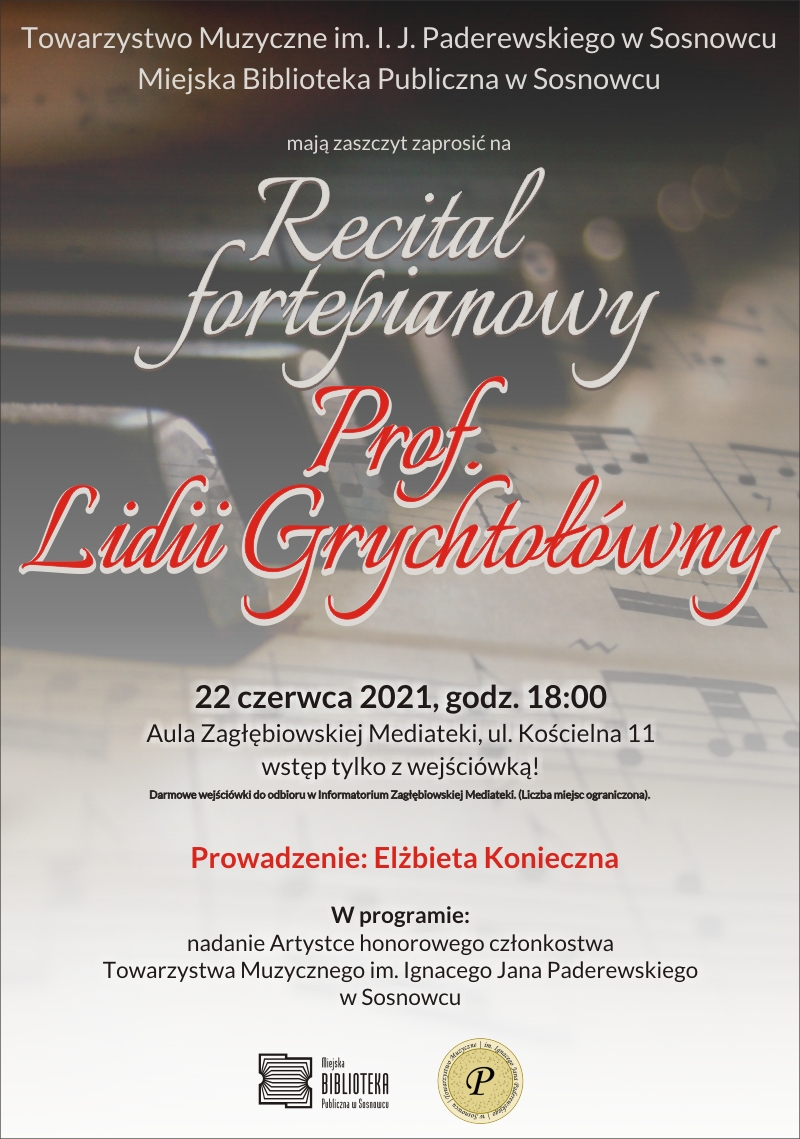 Miejska Biblioteka Publiczna w Sosnowcu i Towarzystwo Muzyczne im. Ignacego Jana Paderewskiego w Sosnowcu mają zaszczyt zaprosić na recital fortepianowy Prof. Lidii Grychtołówny, który odbędzie się we wtorek  22 czerwca 2021 o godz. 18.00 w Auli Zagłębiowskiej Mediateki przy ul. Kościelnej 11. W programie: nadanie Artystce honorowego członkostwa Towarzystwa Muzycznego im. Ignacego Jana Paderewskiego w Sosnowcu. Prowadzenie: Elżbieta Konieczna. Wstęp wolny – obowiązują bezpłatne wejściówki.