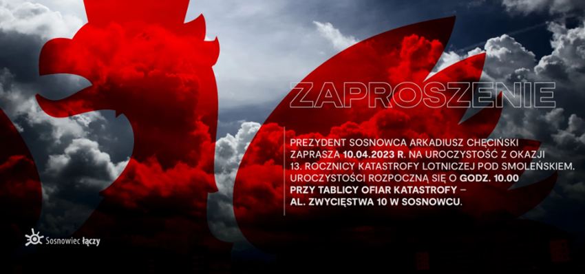 Prezydent Sosnowca Arkadiusz Chęciński zaprasza 10 kwietnia na uroczystości z okazji 13. rocznicy katastrofy lotniczej pod Smoleńskiem.