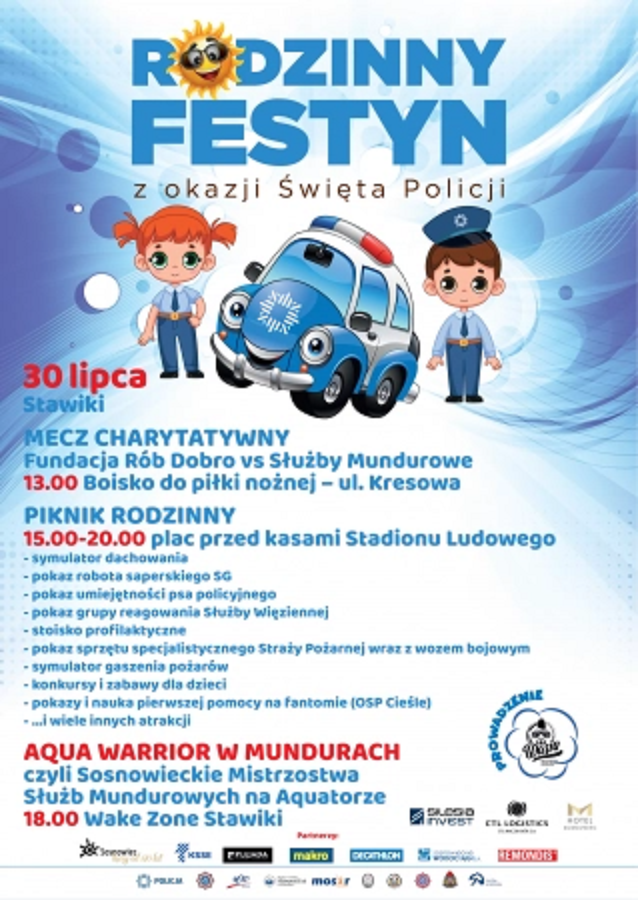 O godz. 13.00 na boisku bocznym przy ul. Kresowej rozegrany zostanie mecz piłki nożnej pomiędzy Fundacją Rób Dobro a Służbami Mundurowymi. O godz. 15.00 na placu przed wejściem na Stadion Ludowy rozpocznie się festyn. Będzie można zobaczyć symulatory dachowania, roboty saperskie, pokaz umiejętności psów policyjnych i pokazy sprzętu. Zaplanowano konkursy i zabawy.