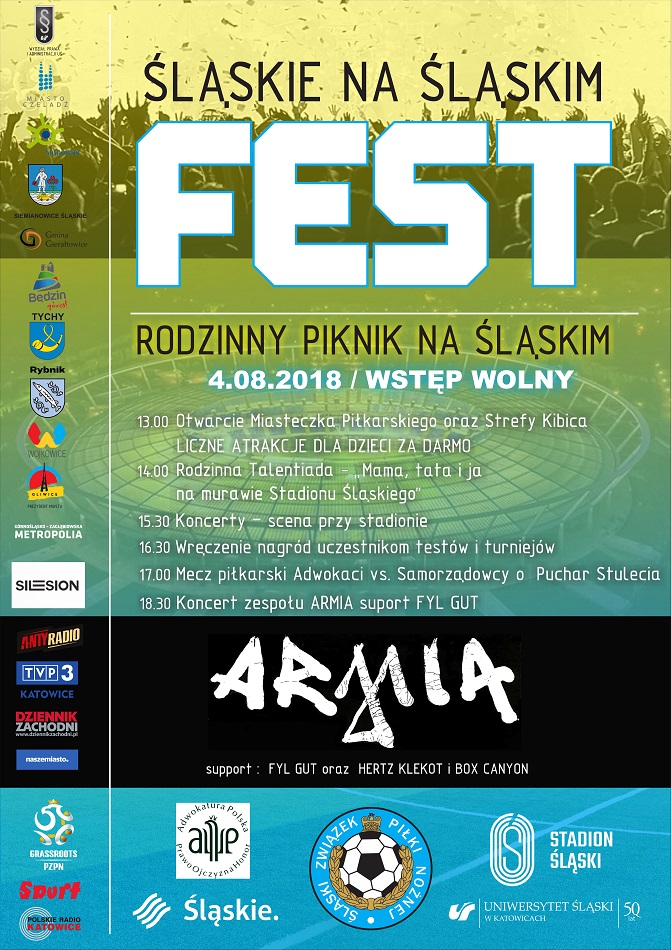 Jednocześnie świętować będziemy obchody 20-lecia Województwa Śląskiego, 50-lecie Uniwersytetu Śląskiego oraz 100-lecie Adwokatury Polskiej. Od godziny 14.00 do godz. 16.30 na scenie zagrają zespoły: HERTZ KLEKOT oraz amerykańsko polsko – brytyjski BOX CANYON. O godzinie 17.00 rozpocznie się mecz Piłkarski Adwokaci vs. Samorządowcy o Puchar Stulecia. O godzinie 18.00 Dekoracja zwycięskiej drużyny. O godzinie 18.30 Koncert gwiazda – legendarnego zespół ARMIA. Suport FYL GUT. Wstęp Wolny.
