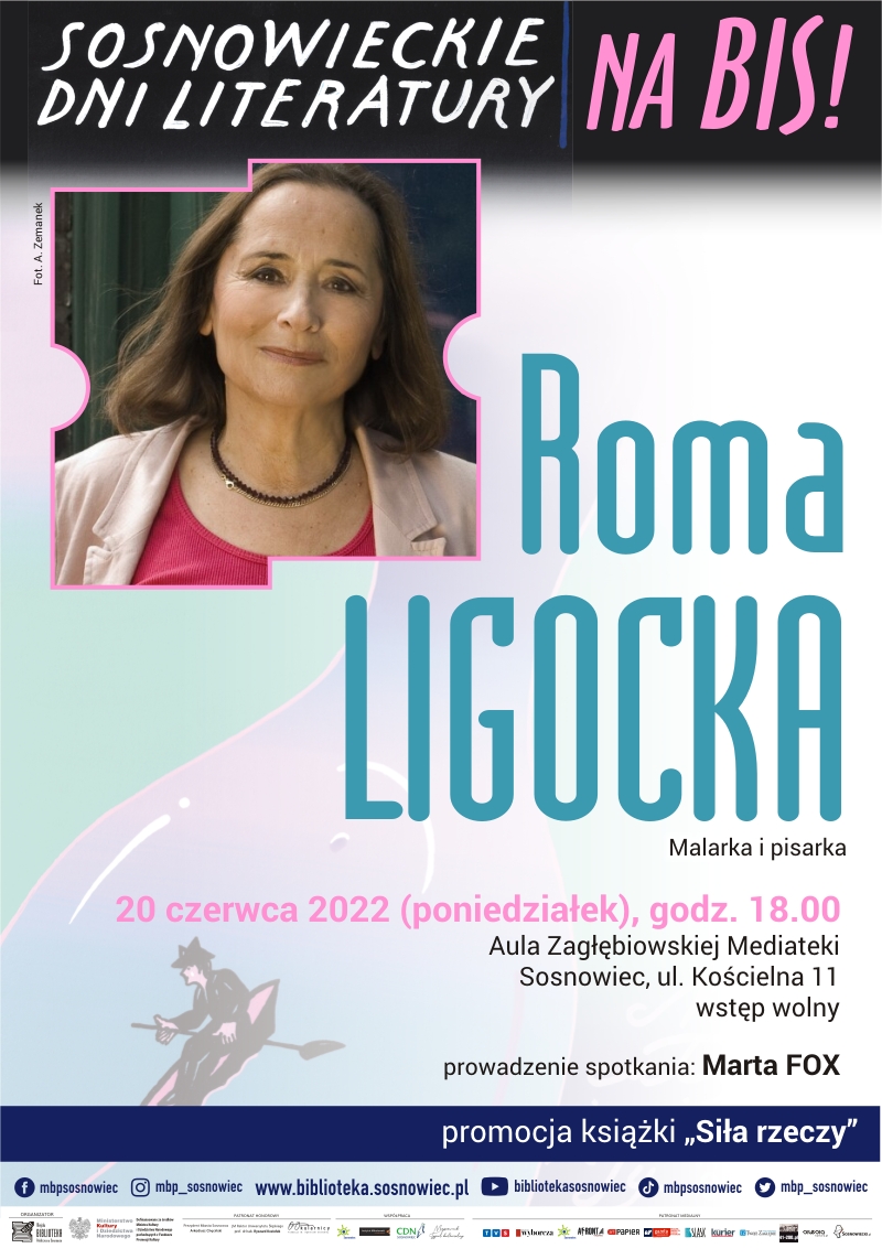 W ramach tegorocznej, osiemnastej, edycji Sosnowieckich Dni Literatury czytelnicy mogli oddać głosy na osobę, którą chcieliby gościć w Zagłębiowskiej Mediatece w ramach akcji „Sosnowieckie Dni Literatury na BIS”. Po przeliczeniu głosów, okazało się, że pierwsze miejsce zdobyła Roma Ligocka! Spotkanie z pisarką odbędzie się 20 czerwca 2022 o godz. 18.00 w Auli Zagłębiowskiej Mediateki przy ul. Kościelnej 11. Rozmowę poprowadzi Marta Fox. Wstęp wolny.