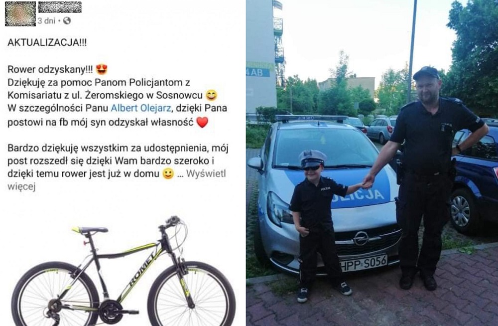 Jedna z sosnowiczanek w mediach społecznościowych podziękowała dzielnicowemu za odzyskanie roweru jej syna, który został skradziony na początku miesiąca z terenu jednej ze szkół. Wrócił do młodego właściciela, zanim jego mama zdążyła złożyć zawiadomienie o kradzieży. Było to możliwe dzięki mieszkańcom Sosnowca, dzielnicowemu i internautom, którzy błyskawicznie zareagowali na zamieszczony przez policjanta post.