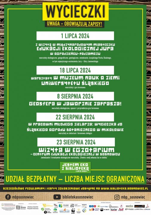 Miejska Biblioteka Publiczna w Sosnowcu – organizator akcji „Jestem EKO z BIBLIOTEKĄ – lato 2024” zaprasza do udziału w obfitujących w atrakcje wycieczkach, połączonych z warsztatami ekologicznymi, spacerami edukacyjnymi i grami terenowymi.