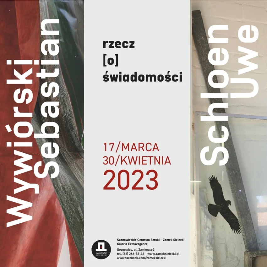 Wystawa „Rzecz[o]świadomości” jest prezentacją twórczości dwóch artystów – Sebastiana Wywiórskiego (Polska) oraz Uwego Schloena (Niemcy). Artystów, pracujących w różnych mediach i eksponujących swoje prace pod różnymi tytułami, łączy pokrewna percepcja świata i obecnego w nim człowieka. Tytuł jaki nadałam wystawie jest ważną grą słów wyjaśniającą światopogląd artystów. Sugeruje, że obecne w świecie rzeczy, to nie neutralne przedmioty i figury, które można dowolnie (i bez konsekwencji) „używać”. Wskazuje także, że u podstaw procesu twórczego artystów spoczywa zaangażowana praca świadomości. Artyści pytają o istotę i konsekwencje ruchu (jako świadomości, jako zmiany miejsca położenia oraz jako ruchu w obrębie przedmiotu – dzieła) oraz o tożsamość rzeczy i jej relację z człowiekiem. Są uczestnikami żywej dyskusji na temat destrukcji, którą propaguje ciągle obecny antropocentryzm i jego szkodliwa potrzeba hierarchizowania bytów. W tej dyskusji, Wywiórski i Schloen, zajmują pozycję adwokatów, tych (pozornie) niemych bytów. Artyści rozumieją bowiem opór rzeczy przed ich „używaniem”, awersję wobec wikłania w niepasujące im kompozycje i konteksty. Rzeczy, jak zobaczymy na wystawie, nie pretendują do pełnienia funkcji wyłącznie estetycznej (choć, gdy zechcą, to mogą). Rzeczy na wystawie „Rzecz[o]świadomości” są przekorne, oporne i obrażone. Czasem milczące, czasem agresywne.