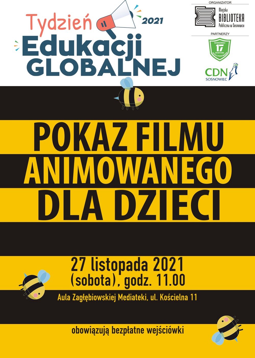 Miejska Biblioteka Publiczna w Sosnowcu serdecznie zaprasza dzieci i rodziców na seans filmowy, organizowany w ramach obchodów Ogólnopolskiego Tygodnia Edukacji Globalnej 2021, który odbędzie się w sobotę 27 listopada 2021 o godz. 11.00 w Auli Zagłębiowskiej Mediateki (ul. Kościelna 11, poziom 0). Ilość miejsc jest ograniczona – obowiązują bezpłatne wejściówki, dostępne w Informatorium Zagłębiowskiej Mediateki (ul. Kościelna 11, poziom I).