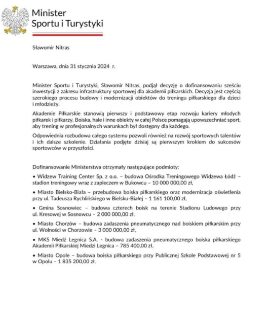 Dotację otrzymały: Widzew Training Center, miasto Bielsko-Biała, miasto Sosnowiec, miasto Chorzów, MKS Miedź Legnica S.A. oraz miasto Opole. Na uwagę zasługuje to, że tylko projekty czterech klubów Fortuna 1 Ligi zyskały uznanie Ministerstwa Sportu i Turystyki.