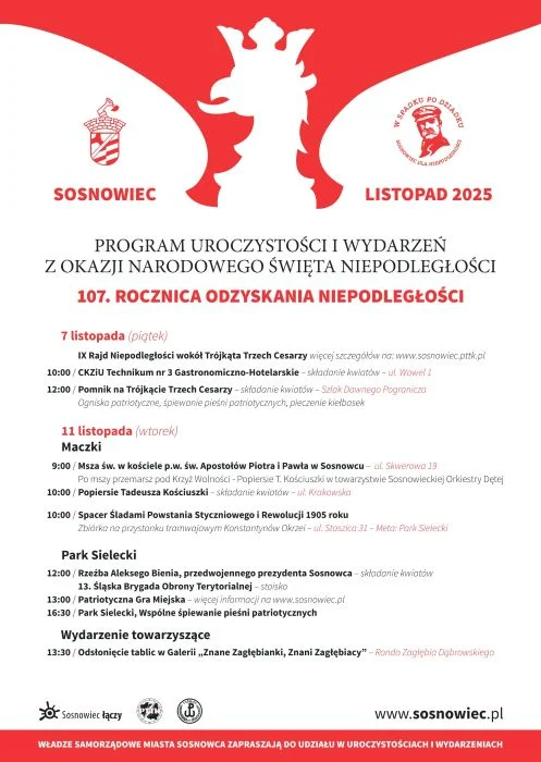 W Sosnowcu przygotowano bogaty program obchodów 107. rocznicy odzyskania przez Polskę niepodległości. Wydarzenia rozpoczną się już 7 listopada i potrwają do 11 listopada, obejmując rajdy, koncerty oraz wspólne śpiewanie pieśni patriotycznych.