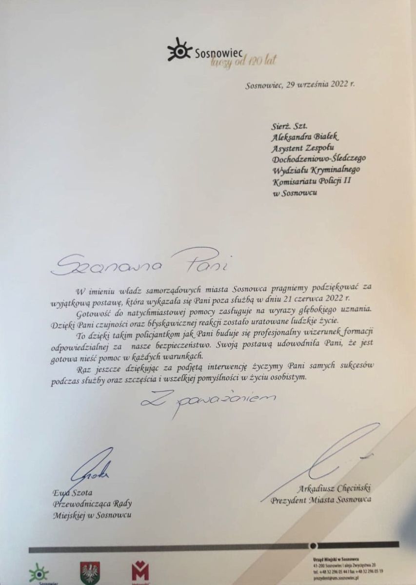 W dniu 29.09.2022 roku podczas sesji Rady Miasta Sosnowca Przewodnicząca Rady Miejskiej Ewa Szota i Prezydent Arkadiusz Chęciński w imieniu władz samorządowych w sposób szczególny wyróżnili i podziękowali sosnowieckiej policjantce za uratowanie życia dziecku.