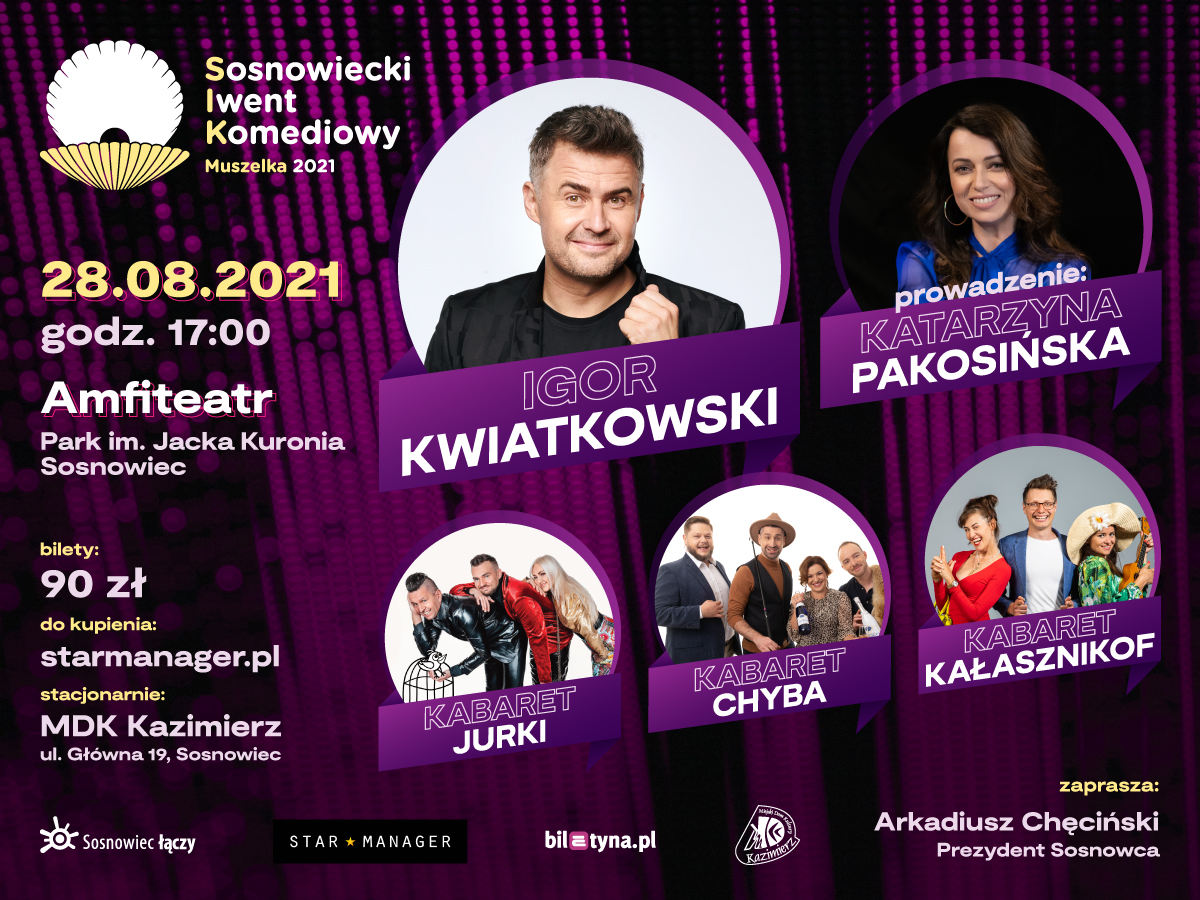 Igor Kwiatkowski, Kabaret Jurki, Kabaret Chyba i Kabaret Kałasznikof. Wydarzenie poprowadzi Katarzyna Pakosińska. Bilety już są dostępne w cenie 90 zł. Aby je kupić, wystarczy wejść na stronę www.sosnowiec.pl. SIK już 28 sierpnia o godzinie 17.00.