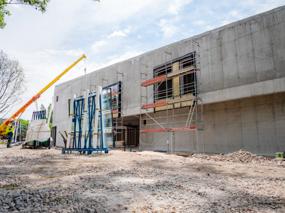 Po zakończeniu prac przy bryle budynku przyszedł czas na montaż pierwszych konstrukcji stalowych antresoli. Kolejnym krokiem będzie montaż dźwigarów dachu z drewna klejonego. Te elementy będą miały ponad 30 metrów długości!