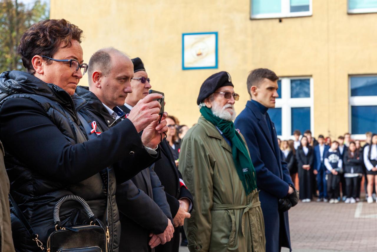 “Przyszłyśmy specjalnie do szkoły, żeby wziąć udział w akademii i w akcji śpiewania hymnu. Mamy dzisiaj tylko zajęcia praktyczne nauki zawodu w planie. Uważamy, że to super, robimy coś razem, tyle osób przychodzi, ta orkiestra, występ. Fajnie, że data jest zamieniona na godzinę jedenasta jedenaście zamiast jedenasty listopada. Damy te zdjęcia na Instagrama. Jesteśmy w pierwszej klasie i pierwszy raz widzimy takie święto”. – mówią Ola i Oliwia Uczennice klasy pierwszej na kierunku cukiernik.