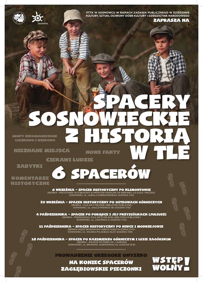6 spacerów historycznych po dzielnicach miasta Sosnowca tj: Klimontów, Zagórze, Juliusz, Porąbka, Ostrowy Górnicze, Kazimierz Górniczy, Niwka