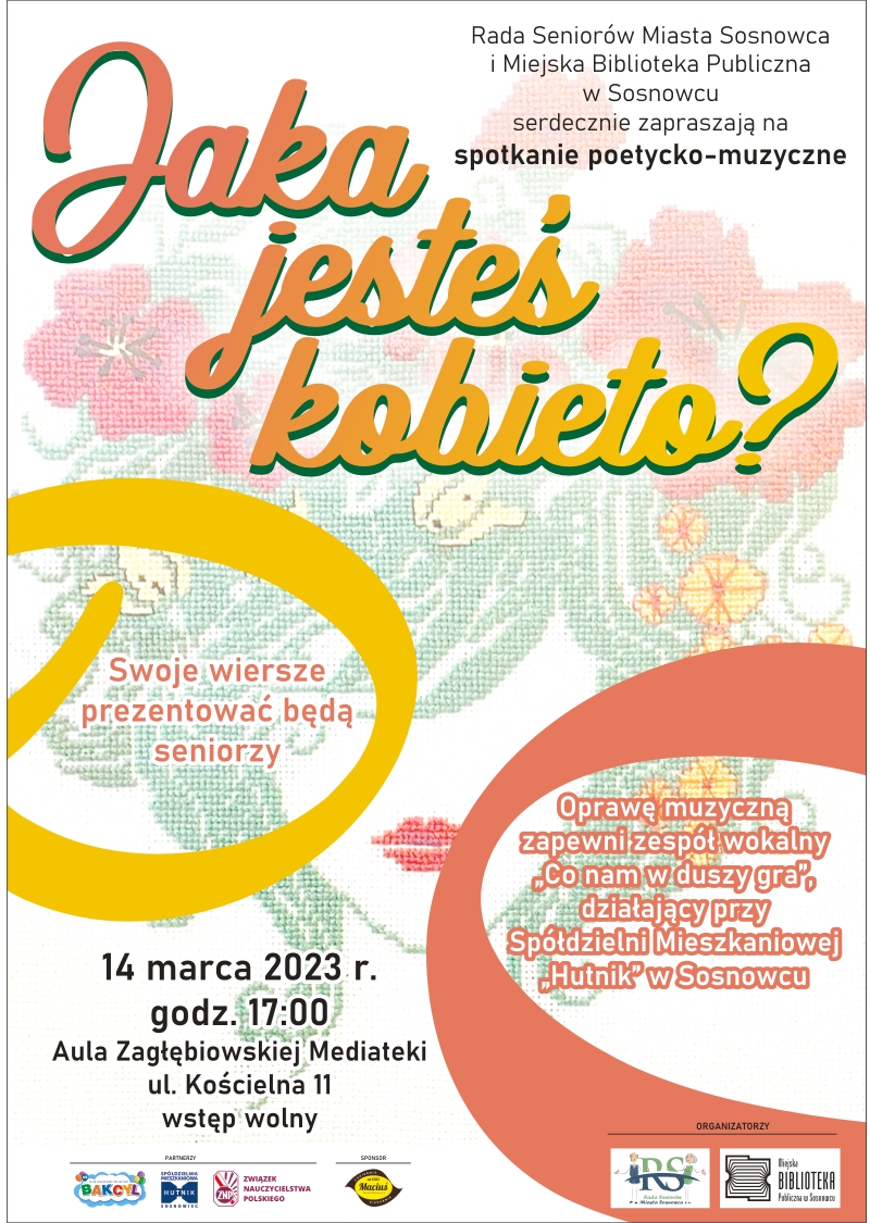 Rada Seniorów Miasta Sosnowca serdecznie zaprasza we wtorek 14 marca 2023 o godz. 17.00, do Auli Zagłębiowskiej Mediateki przy ul. Kościelnej 11 w Sosnowcu, na spotkanie poetycko-muzyczne “Jaka jesteś kobieto?”.