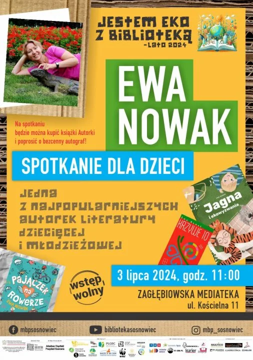 Miejska Biblioteka Publiczna w Sosnowcu – organizator akcji „Jestem EKO z BIBLIOTEKĄ – lato 2024” – serdecznie zaprasza na spotkanie z autorką bestsellerowych książek dla dzieci – Ewą Nowak. Spotkanie odbędzie się w środę 3 lipca o godz. 11.00 w Zagłębiowskiej Mediatece przy ul. Kościelnej 11.