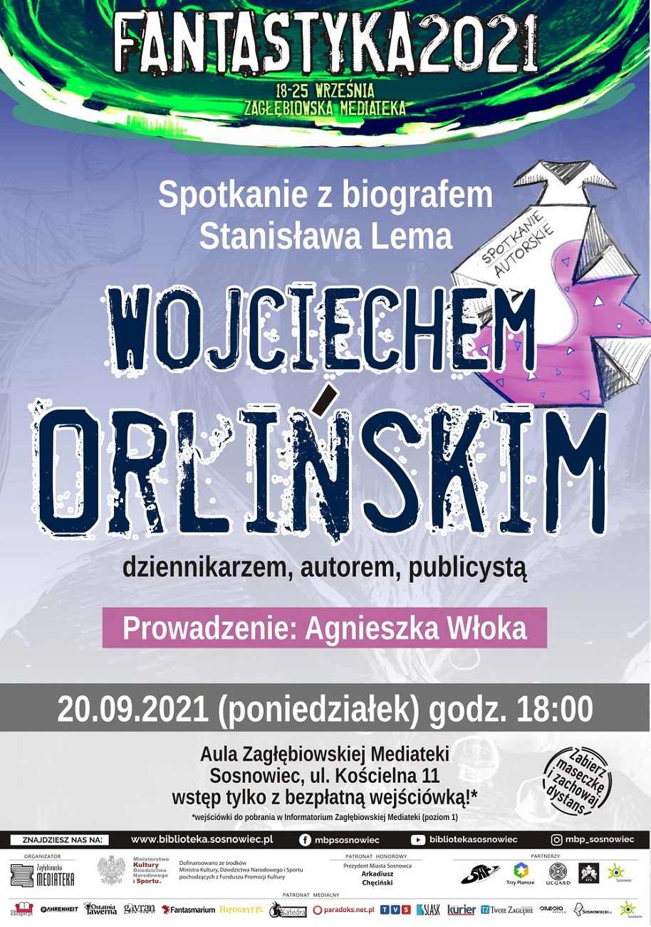 Zagłębiowska Mediateka w Sosnowcu, organizator projektu FANTASTYKA2021, serdecznie zaprasza w poniedziałek 20 września 2021 o godz. 18.00 do udziału w spotkaniu autorskim z Wojciechem Orlińskim – dziennikarzem, publicystą, biografem Stanisława Lema. Rozmowę w Auli Zagłębiowskiej Mediateki (ul. Kościelna 11) poprowadzi Agnieszka Włoka. Wstęp wolny – obowiązują bezpłatne wejściówki.