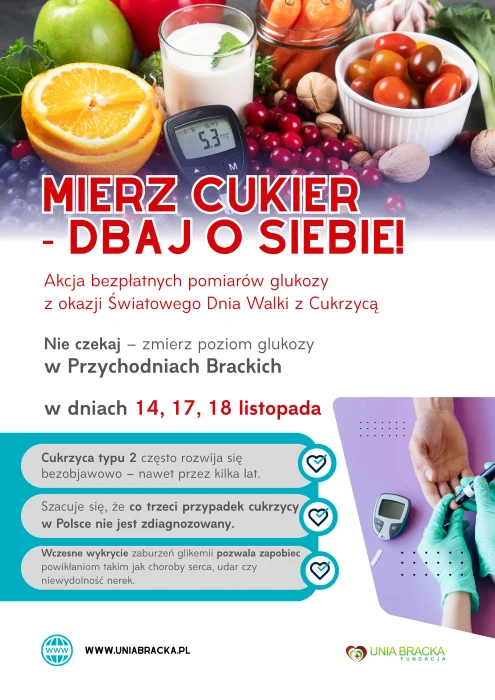Z okazji Światowego Dnia Cukrzycy Fundacja „Unia Bracka” zaprasza na bezpłatne badania poziomu glukozy we krwi w 16 Przychodniach Brackich. Mieszkańcy Zabrza, Gliwic, Knurowa, Katowic, Sosnowca, Rudy Śląskiej, Bytomia i Mysłowic będą mogli skorzystać z badań 14, 17 i 18 listopada w ramach akcji „Mierz cukier – dbaj o siebie”.