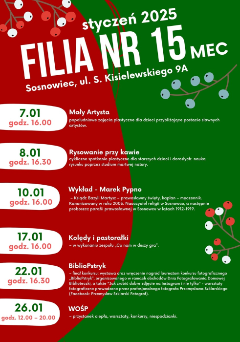 Styczeń w Filii nr 15 Miejskiej Biblioteki Publicznej w Sosnowcu zapowiada się bardzo interesująco! Zachęcamy do zapoznania się ze szczegółami programu. Udział we wszystkich imprezach kulturalnych i warsztatach jest bezpłatny.