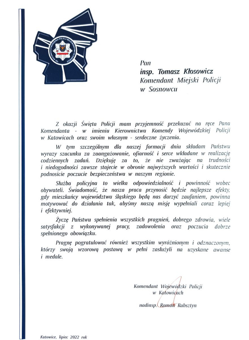 11 lipca, podczas uroczystej akademii z okazji Święta Policji, sosnowieckie policjantki i policjanci otrzymali akty mianowania na wyższe stopnie policyjne z rąk I Zastępcy Komendanta Wojewódzkiego Policji w Katowicach insp. Mariusza Krzystyniaka.