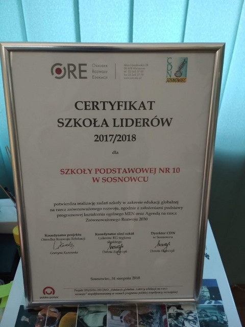 Szkoła Podstawowa nr 10 im. Orła Białego w Sosnowcu 25 marca 2019 r. otrzymała “Certyfikat Szkoły Liderów” przyznany przez Ośrodek Rozwoju Edukacji.