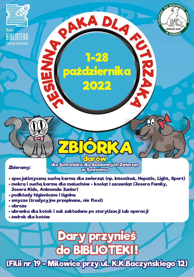 Filia nr 19 – Milowice Miejskiej Biblioteki Publicznej w Sosnowcu serdecznie zaprasza do udziału w akcji „Jesienna Paka dla Futrzaka”. Zbiórka darów dla Schroniska dla Bezdomnych Zwierząt w Sosnowcu trwa od 1 do 28 października w godzinach otwarcia placówki.