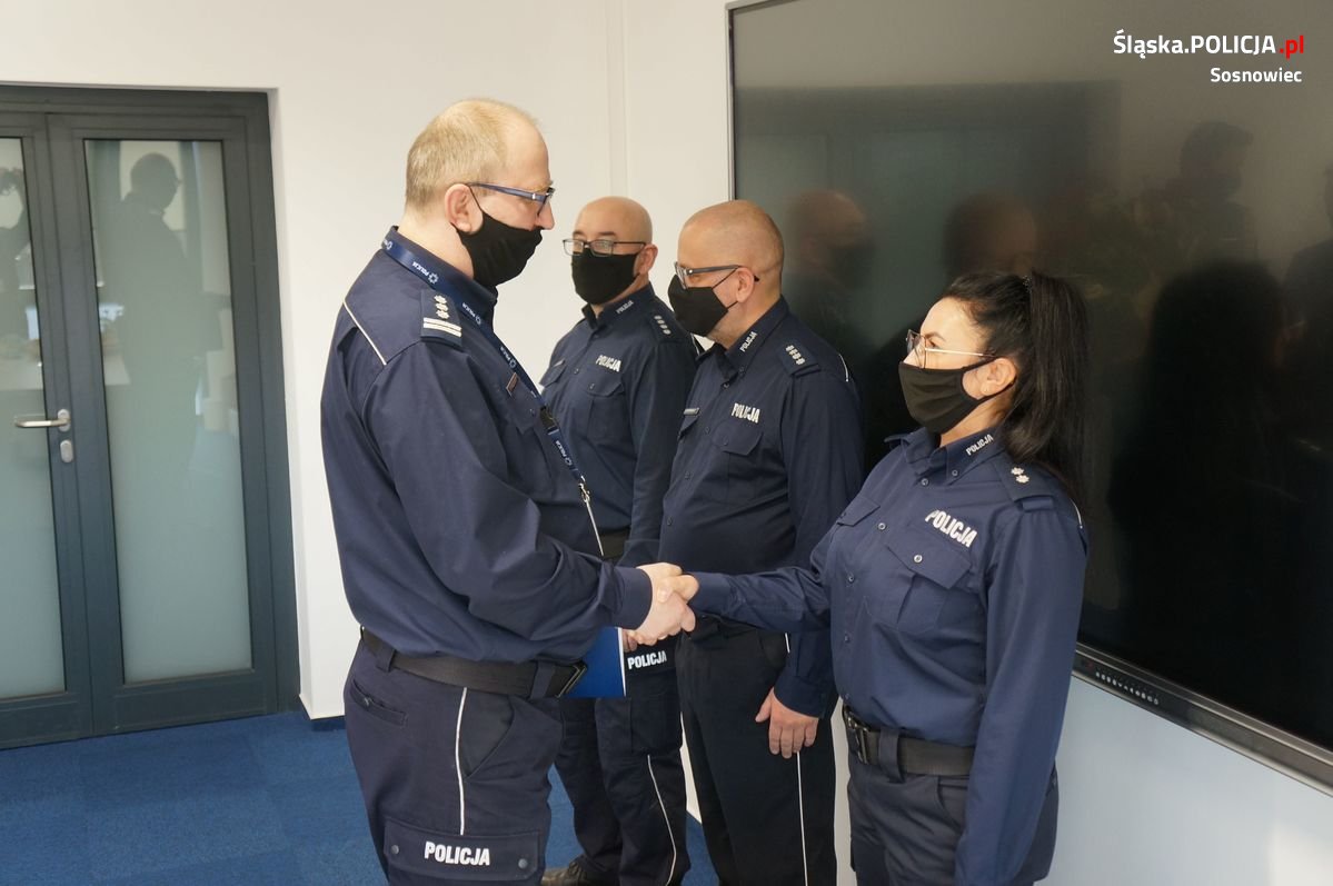 Spotkanie stało się również okazją do przekazania szczególnych wyrazów uznania sosnowieckiej Strażniczce Miejskiej – insp. Klaudii Koziara, która w dniu 18.02.2022 roku na ulicy Targowej w Sosnowcu przeprowadziła resuscytację mężczyzny, dzięki czemu udało się uratować jego życie. Komendant Miejski Policji w Sosnowcu insp. Tomasz Kłosowicz wręczył jej okolicznościowy dyplom i przekazał jej wyrazy najwyższego uznania i pogratulował jej wspaniałej postawy w służbie.