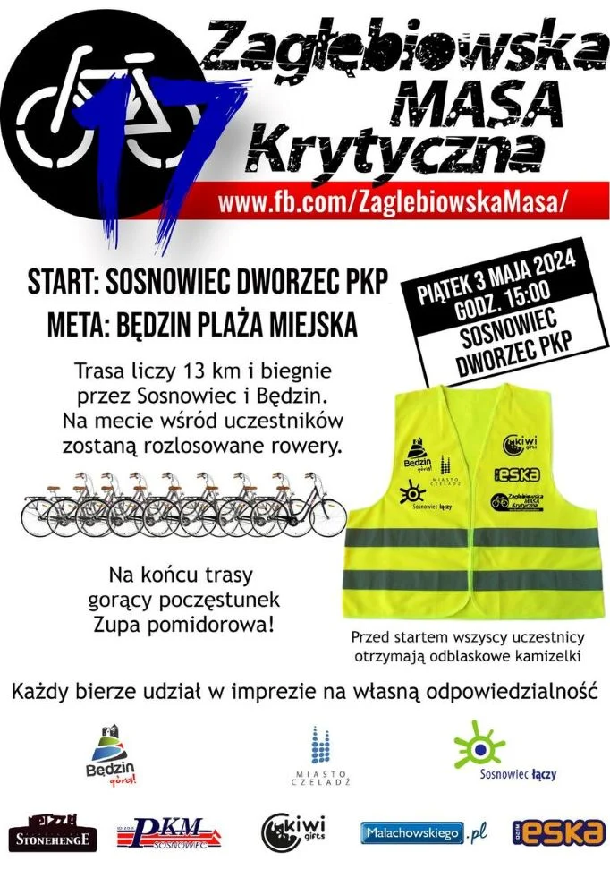 Jak co roku, 3 maja o godzinie 15:00 ulicami Sosnowca przejedzie Zagłębiowska Masa Krytyczna. Jedna z największych imprez rowerowych organizowana jest już po raz 17. W związku z przejazdem rowerzystów wystąpią czasowe utrudnienia w ruchu drogowym.