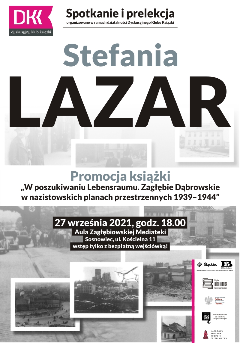 Zagłębiowska Mediateka serdecznie zaprasza 27 września 2021 o godz. 18.00 na spotkanie ze Stefanią Lazar promujące jej najnowszą książkę „W poszukiwaniu Lebensraumu. Zagłębie Dąbrowskie w nazistowskich planach przestrzennych 1939–1944” wydaną przez Muzeum Saturn w Czeladzi.