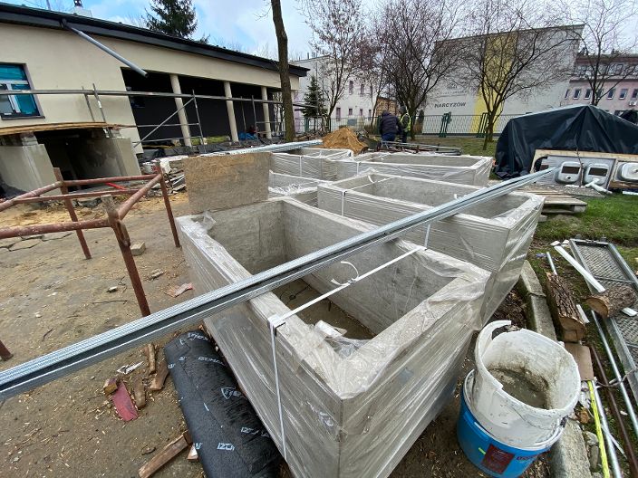 – Zagospodarujemy deszczówkę z dachu placówek systemem rynien do specjalnych donic z zielenią, które będą ułożone kaskadowo. Dzięki temu w naturalny sposób będą nawadniane – dodaje Jeremiasz Świerzawski.