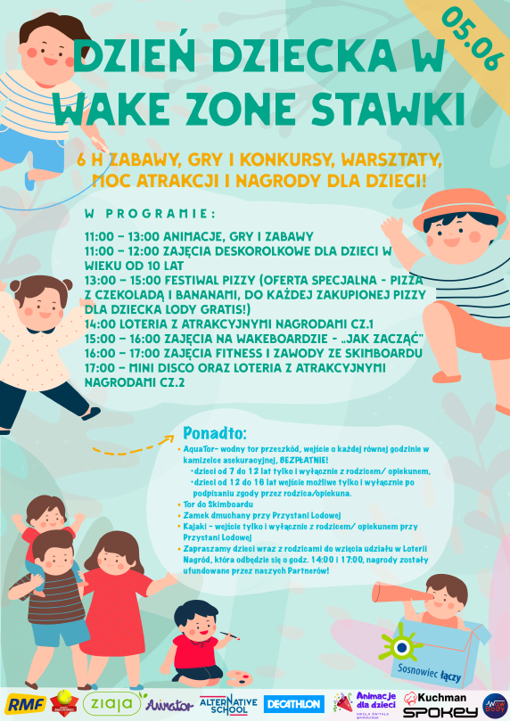 5 czerwca od godz.11.00 do 17.00 Wake Zone Stawiki w Sosnowcu zaprasza dzieci wraz z rodzicami na świętowanie Dnia Dziecka.