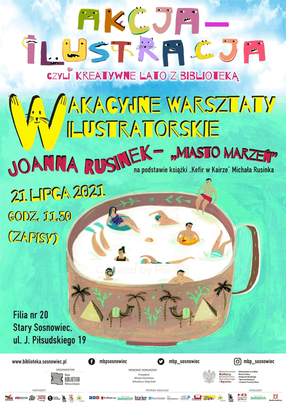Miejska Biblioteka Publiczna w Sosnowcu – organizator wakacyjnego projektu „Akcja-ilustracja, czyli kreatywne lato z biblioteką” – serdecznie zaprasza w środę 21 lipca 2021 o godz. 11.30 do udziału w wyjątkowych warsztatach ilustratorskich dla dzieci (w wieku 7-12 lat). Gościem Filii nr 20 – Stary Sosnowiec (ul. J. Piłsudskiego 19) będzie Joanna Rusinek – ilustratorka i pisarka. Podstawą warsztatów zatytułowanych „Miasto marzeń” będzie książka Michała Rusinka „Kefir w Kairze”. Wstęp wolny – obowiązują zapisy.