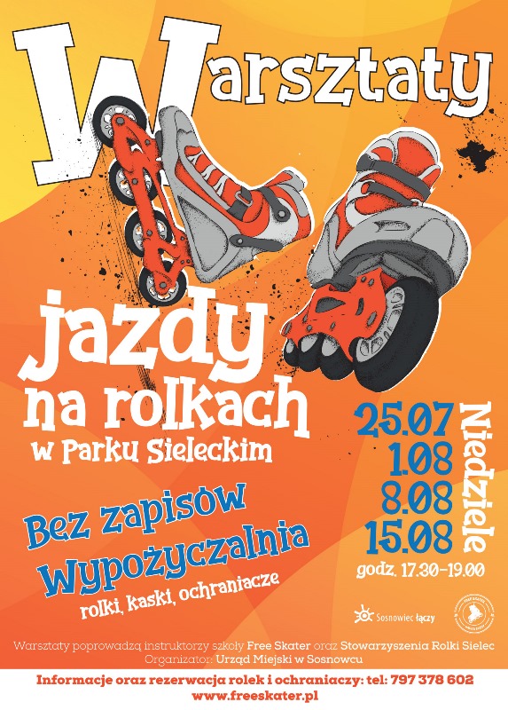 W niedzielę 1 sierpnia zapraszamy do Parku Sieleckiego na kolejną odsłonę warsztatów jazdy na rolkach. Warsztaty prowadzą instruktorzy szkoły Free Skater oraz Stowarzyszenia Rolki Sielec. Początek godz. 17.30. Warsztaty będą się odbywać także w sierpniowe niedziele, tj. 8 oraz 15.