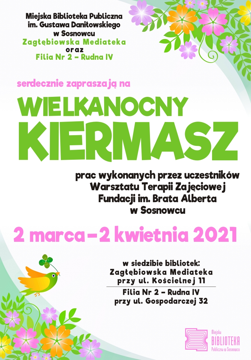 Zagłebiowska Mediateka przy ul. Kościelnej 11 oraz Filia nr 2 – Rudna IV przy ul. Gospodarczej 32 serdecznie zapraszają na “Wielkanocny kiermasz” prac wykonanych przez uczestników Warsztatu Terapii Zajęciowej Fundacji im. Brata Alberta w Sosnowcu w dn. 2 marca – 2 kwietnia 2021. Kiermasz udostępniany jest w godzinach otwarcia placówek. Wstęp wolny.
