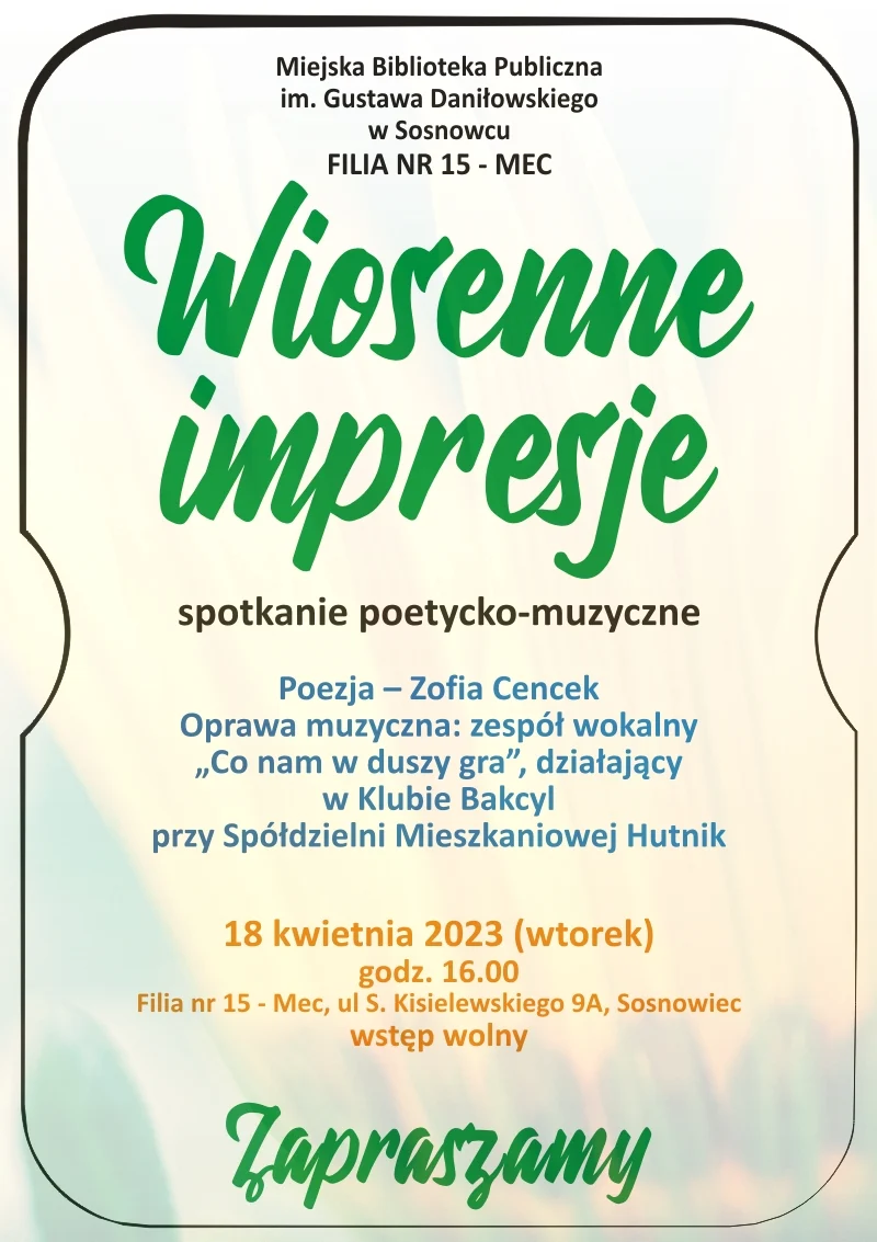 Filia nr 15 – Mec Miejskiej Biblioteki Publicznej w Sosnowcu, serdecznie zaprasza we wtorek 18 kwietnia 2023 o godz. 16.00 na spotkanie poetycko-muzyczne „Wiosenne impresje”.