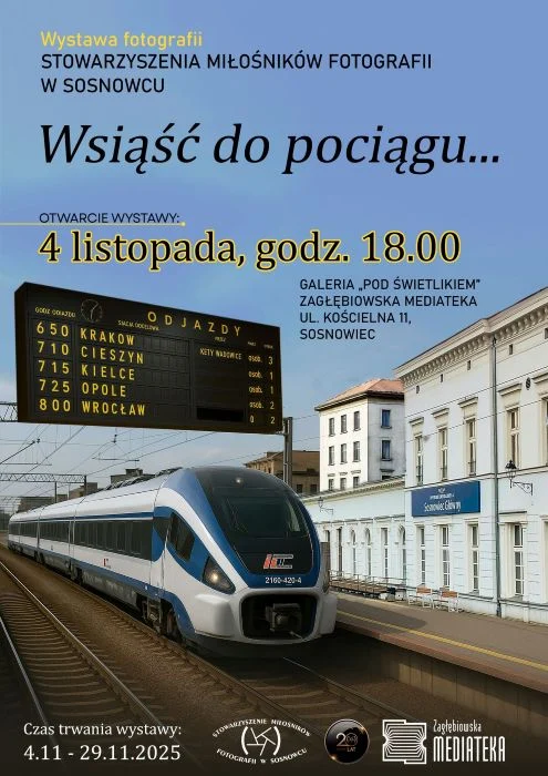 Zagłębiowska Mediateka zaprasza na wernisaż wystawy prac członków Stowarzyszenia Miłośników Fotografii w Sosnowcu pt. „Wsiąść do pociągu”, który odbędzie się 4 listopada 2025 o godz. 18.00 w Galerii „Pod Świetlikiem”. Wystawa prezentowana będzie do 29 listopada 2025. Wstęp wolny.