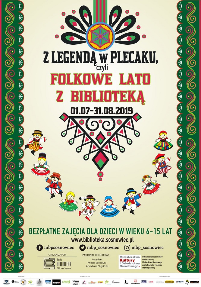 „Z legendą w plecaku, czyli folkowe lato z biblioteką” to interdyscyplinarny projekt wakacyjny dla dzieci (6-15 lat) zachęcający do udziału w zajęciach, które poprzez czytanie i kreatywną zabawę przybliżą dzieciom polskie legendy, baśnie i bajki regionalne oraz cenną wiedzę o polskich tradycjach, obyczajach i kulturze ludowej. Dzieci wraz z bohaterami swych ulubionych książek, przekonają się jak bogaty i zróżnicowany jest świat rodzimego folkloru! W programie znajdą się m.in. arcyciekawe zajęcia świetlicowe, wycieczki, konkursy, projekcje filmowe, warsztaty, spotkanie z pisarzem, akcje plenerowe. Różnorodne propozycje programowe – z zakresu literatury, filmu, plastyki, rękodzieła, kulinariów i nowych technologii – zapewnią interesującą formę spędzenia czasu w gronie rówieśników, a także możliwość rozwoju pasji i wyobraźni. Nie zabraknie wątków historycznych i etnograficznych oraz – przede wszystkim – wyśmienitej zabawy wśród literackich symboli i wzorców przekazywanych z pokolenia na pokolenie.