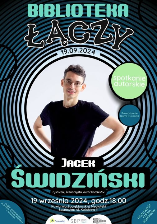 19 września 2024 o godz. 18.00, w ramach projektu „Biblioteka Łączy” realizowanego przez Stowarzyszenie Bibliotekarzy Polskich – Zarząd Oddziału w Katowicach oraz Miejską Bibliotekę Publiczną w Sosnowcu, w Kawiarni Zagłębiowskiej Mediateki odbędzie się spotkanie autorskie z Jackiem Świdzińskim – rysownikiem, scenarzystą, autorem komiksów, ilustracji, grafik i animacji.