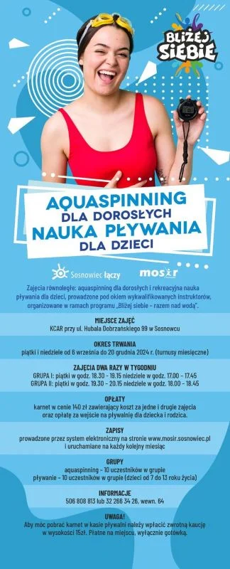 Zapisy odbywać się będą elektronicznie, za pośrednictwem strony http://www.mosir.sosnowiec.pl do 4 września 2024r. We wrześniu zajęcia odbędą się w następujących terminach: 6, 8, 13, 15, 20, 22, 27, 29 września. Informacje dotyczące tej aktywności oraz programu „Bliżej siebie” dostępne są pod numerami 506 808 813 lub 32 266 34 26, wewn. 64