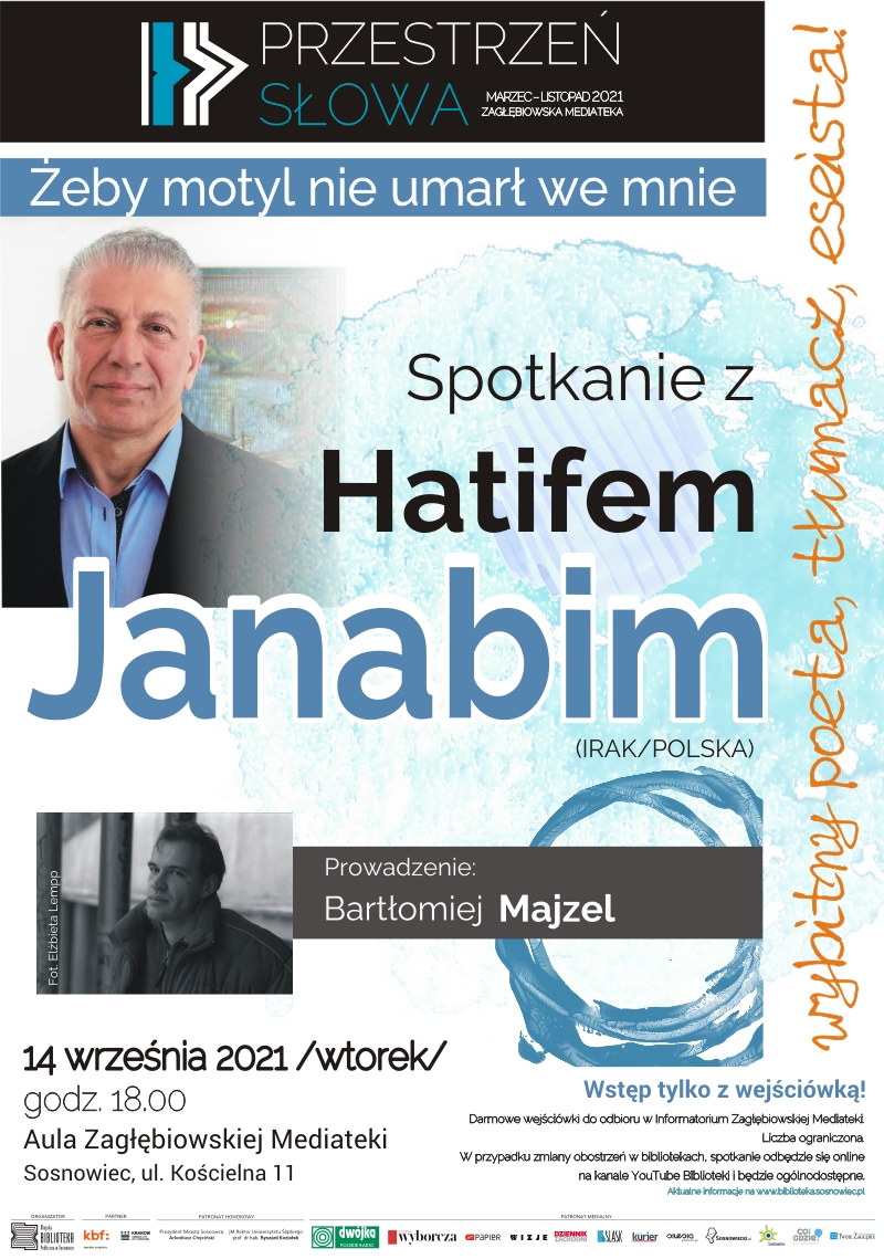 Po wakacyjnej przerwie, z nowymi siłami i pomysłami, powraca Przestrzeń Słowa! 14 września 2021 o godz. 18.00 w Auli Zagłębiowskiej Mediateki (ul. Kościelna 11) w Sosnowcu odbędzie się spotkanie z Hatifem Janabim, pochodzącym z Iraku niezwykłym poetą, tłumaczem i eseistą. Prowadzenie – Bartłomiej Majzel. Wstęp wolny – obowiązują bezpłatne wejściówki.