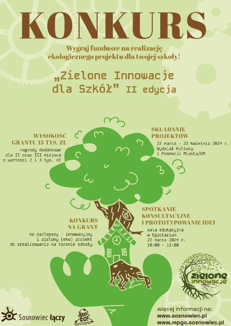Urząd Miejski w Sosnowcu oraz Miejskie Przedsiębiorstwo Gospodarki Odpadami serdecznie zapraszają uczniów sosnowieckich szkół podstawowych i ponadpodstawowych do udziału w II edycji konkursu „Zielone Innowacje dla Szkół”.
